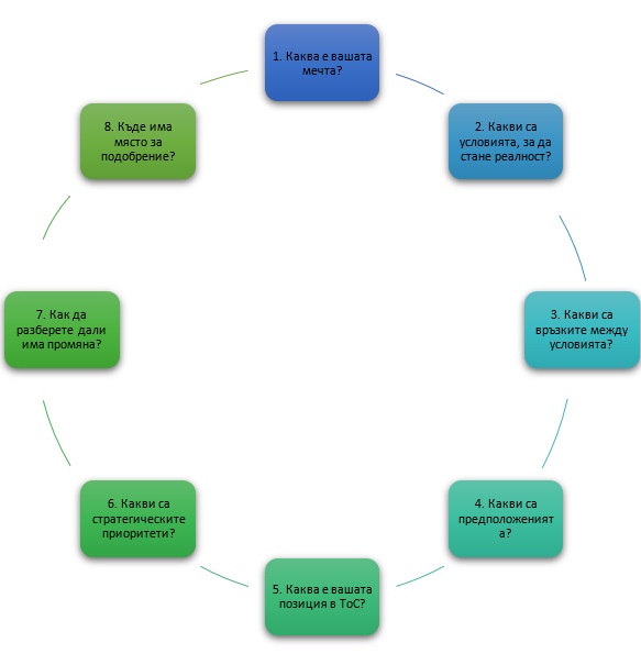 Сега, когато научихте повече за теорията на промяната, е време за упражнение. За да помогнете при създаването на вашата ToC, опитайте да отговорите на следните въпроси от модела по-долу. Започнете с въпрос номер 1 и завършете с въпрос номер 6. Въпрос 7 и 8 се използват за размисъл и могат да бъдат отговорени само след време, когато моделът е приложен.