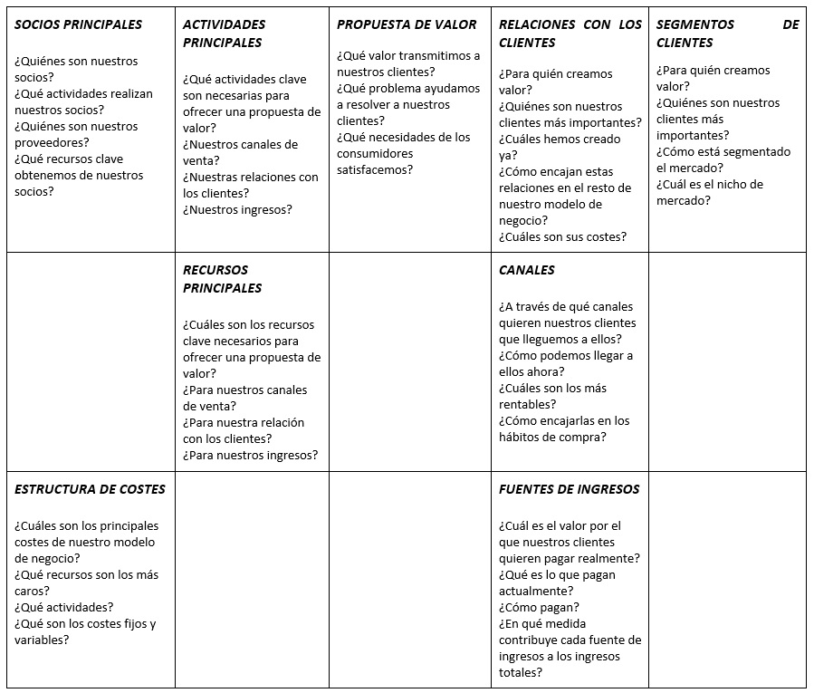Discutir los elementos del modelo, hacer preguntas, para que posteriormente el lienzo esté listo para poder ser rellenado con post-it o rotuladores.