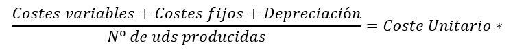 Para calcular el coste unitario, tendrás que determinar el número de unidades que puedes producir/suministrar en un año y dividirlo por el coste total de funcionamiento de la empresa, que debe incluir los costes de depreciación de los activos fijos, los costes variables directos y los costes fijos anuales. Puede ser una estimación general, no tiene que ser exacta. Presta especial atención al periodo de tiempo con el que estás trabajando, los costes unitarios suelen calcularse sobre una base anual como se ha sugerido anteriormente: