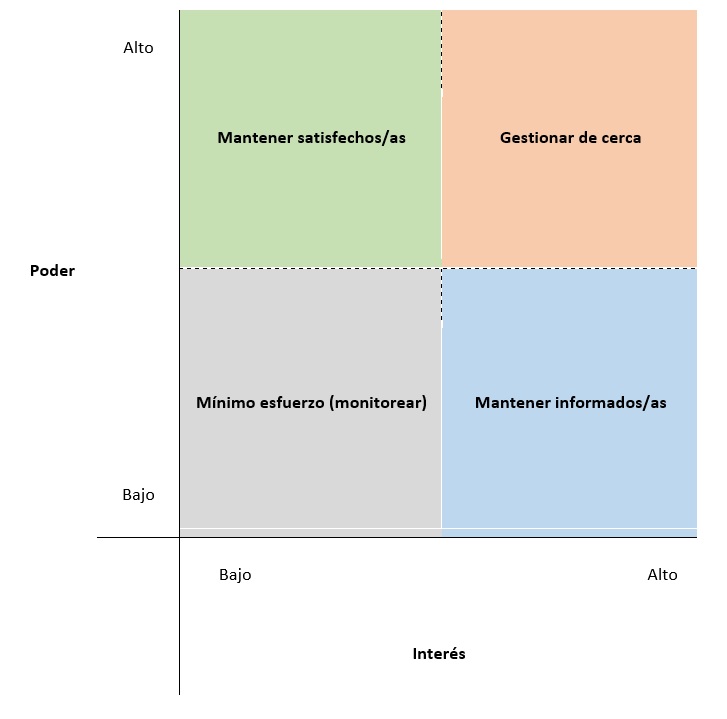 La tabla anterior ayuda a la gestión de las partes interesadas al identificar dos grupos adicionales, además de los más - Gestionar de cerca - y los menos - Esfuerzo mínimo - significativos. Mantener satisfechos a los que tienen poder pero no tienen un interés especial en estas actividades y mantener informados a los que están interesados pero no tienen poder.[1]