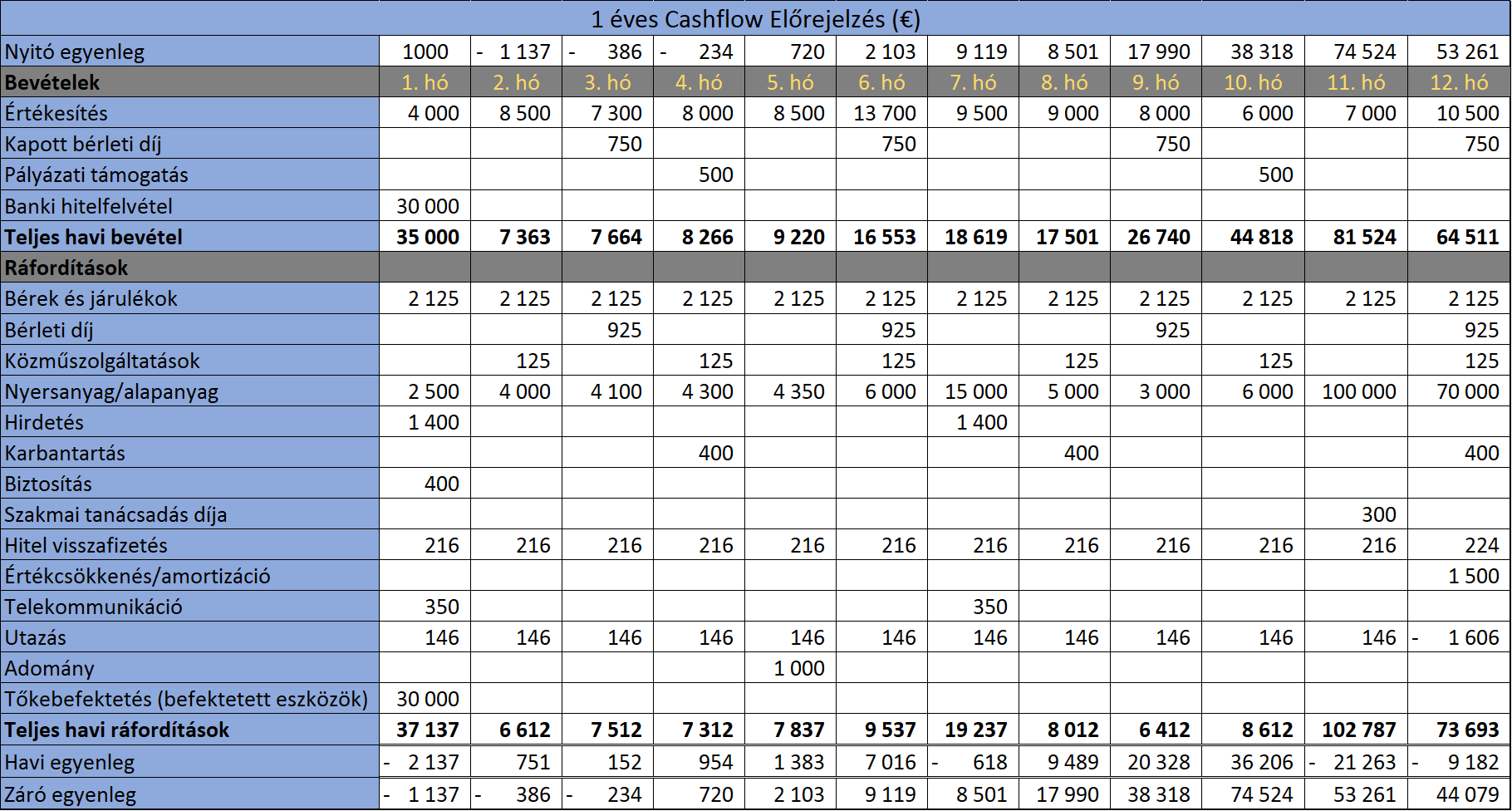 A CF és az eredménykimutatás összeállításakor igyekezzünk ugyanazokat az elnevezéseket használni. Ebben a példában hónapokra bontva láthatóak a bevételek és kiadások. Minél pontosabban tudjuk meghatározni melyik hónapban mire számíthatunk, annál könnyebb lesz megtervezni az éves költségvetést.