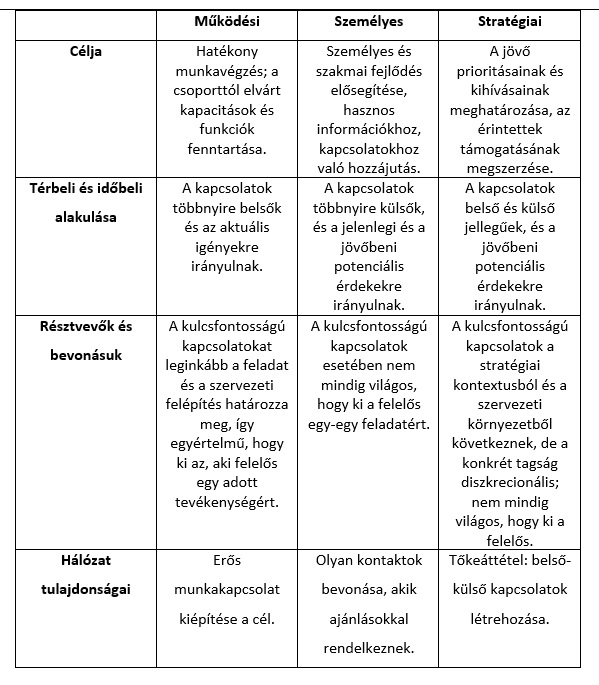 Működési: Partnerek kapcsolata, beszállítók és ügyfelek. Ezek cégként szerződhetnek a vállalkozásunkkal, lehetővé téve a folyamatos üzleti fejlődést, növekedését. Az ilyen hálózatok létrehozásához szükség van a személyes hálózatok láthatóságára és tapasztalatra a stratégiai hálózatok terén.