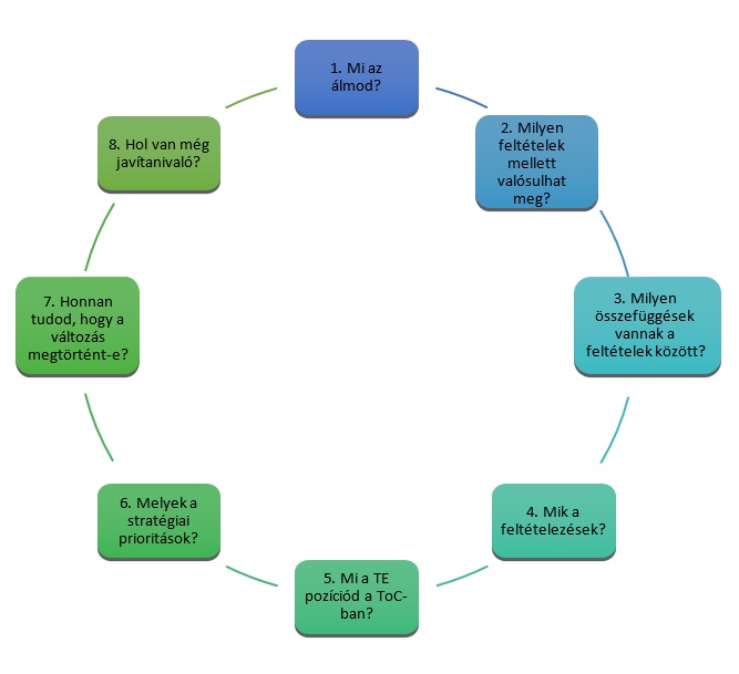 A ToC tervezéshez válaszolja meg a kérdéseket az alábbi modell szerint. Kezdje az 1. kérdéssel, és fejezze be a 6. kérdéssel. A 7. és 8. kérdés önreflexiós célokat szolgál, és csak idővel, a modell megvalósítása után lehet megválaszolni őket.